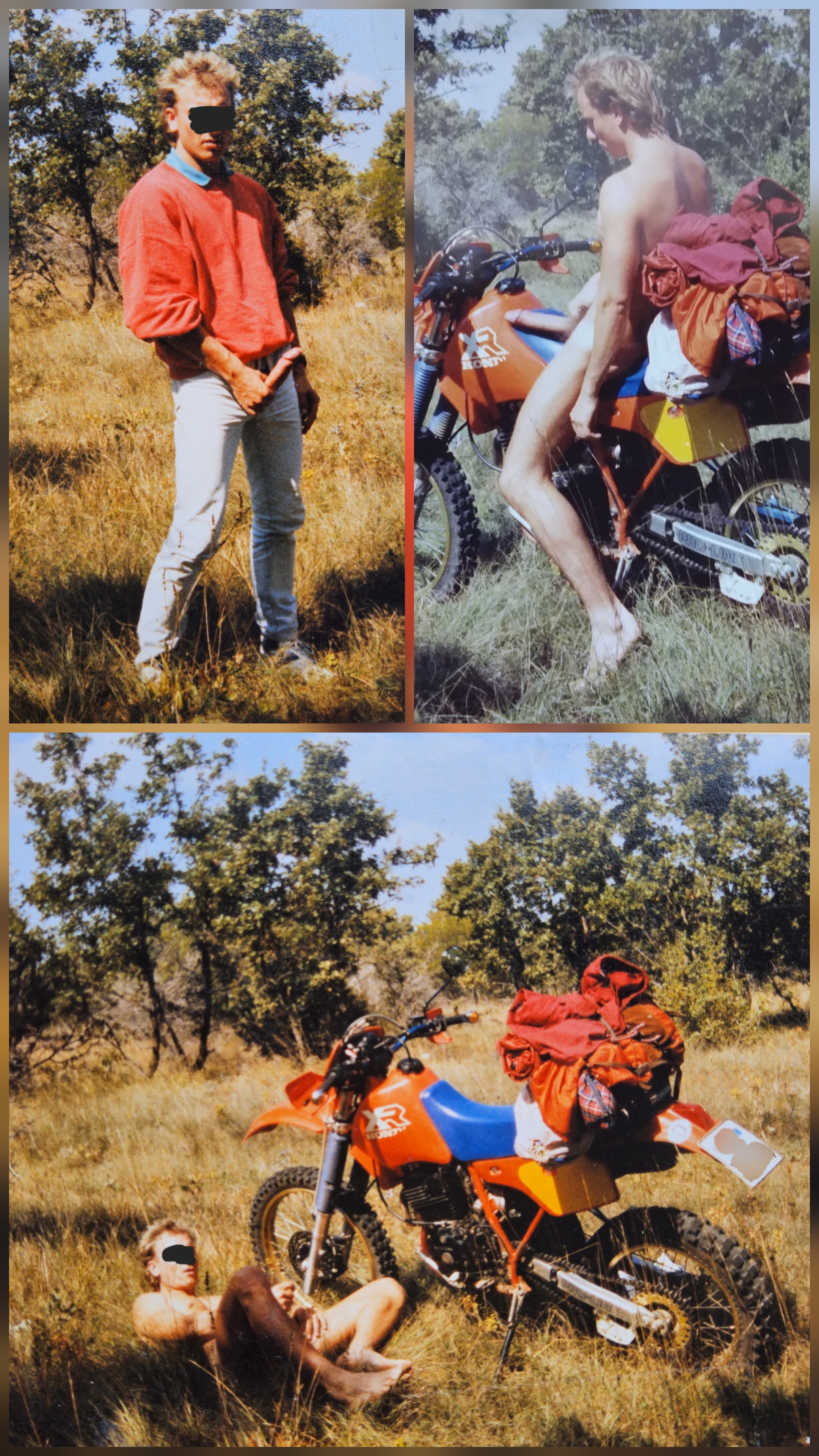 ..was long ago on a South of Europe Motorcycle Trip.. was horny. So went offroad, 1 km from the Street.. masturbated my Cock stiff.. then placed the Stative and Camera - set the SelfTimer on 10 Seconds and made Exhibitionism Selfies.. at the End I layed down in the hot Grass before my Motorcycle . Wichsed/ masturbated wildly until I came and was released from hornyness..